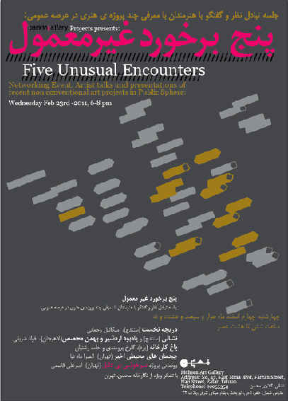 جلسه گفتگو با هنرمندان با معرفي چند پروژه هنري در عرصه عمومي ، امروز ـ چهارم اسفندماه ـ با عنوان «پنج برخورد غير معمول» در حالي گالري محسن برپا مي‌شود كه پروژه «سرخوشي بي‌دليل» اميرعلي قاسمي در حاشيه آن رونمايي خواهد شد.